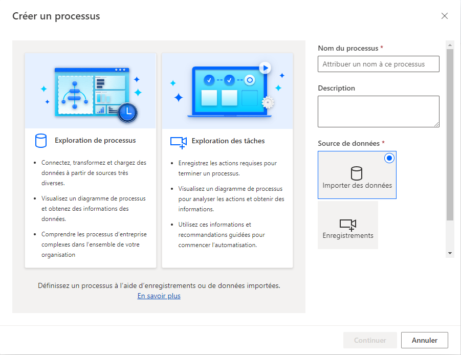 Dans la boîte de dialogue Créer un processus, vous pouvez créer un processus à l’aide du paramètre Importer des données pour une analyse générée par l’IA de vos données métier, ou en créant des Enregistrements pour un processus existant, où l’exploration de processus enregistre les entrées au clavier et les clics de souris pour analyser les processus spécifiques à l’utilisateur. Vous pouvez donc passer de la macro à la micro avec votre analyse de processus.