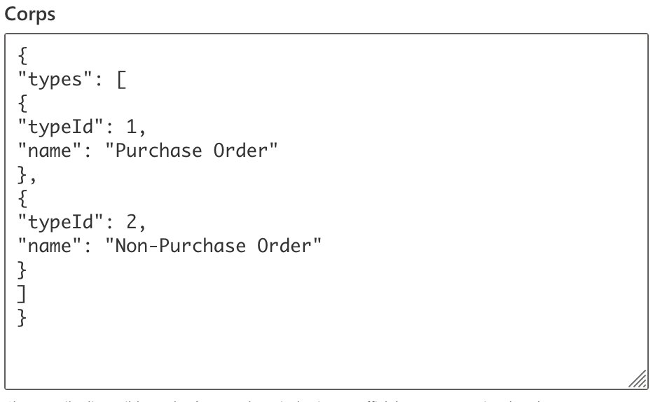 L’API que vous utilisez doit fournir une opération qui renvoie un tableau de valeurs valides et, éventuellement, leurs descriptions. Pour soutenir l’exemple précédent de ID du type de facture, l’API a fourni une opération ListInvoiceTypes qui a renvoyé les données suivantes.