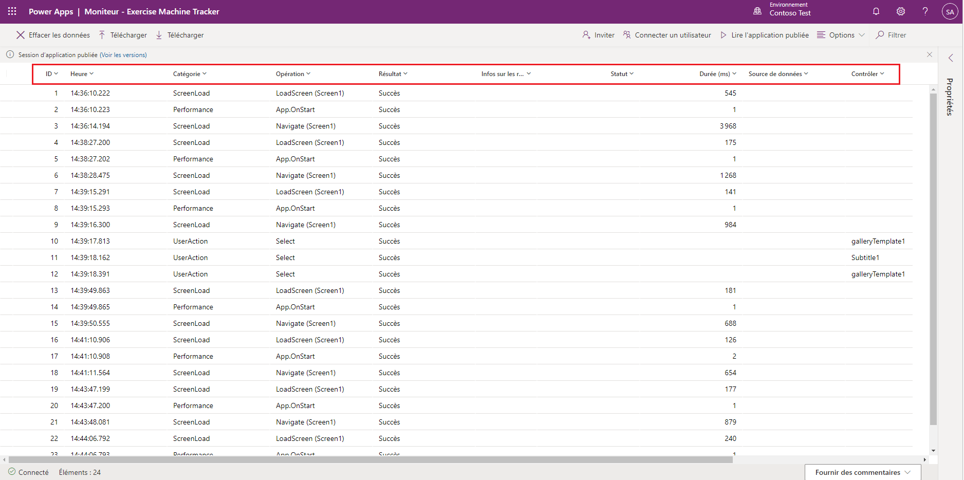 Le tableau de bord Monitor vous permet d’examiner les propriétés de chaque événement d’application. Vous avez ainsi une idée de ce qui se passe lorsque vous sélectionnez un contrôle, de la durée du processus et du résultat de l’opération.