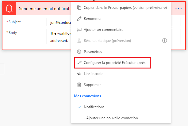 Avec l’option Exécuter après, vous pouvez identifier l’étape qui a échoué et, le cas échéant, la mettre en évidence. Le paramètre réussite dans la notification est la valeur par défaut. Cependant, vous pouvez gérer les erreurs à l’aide du paramètre échec.