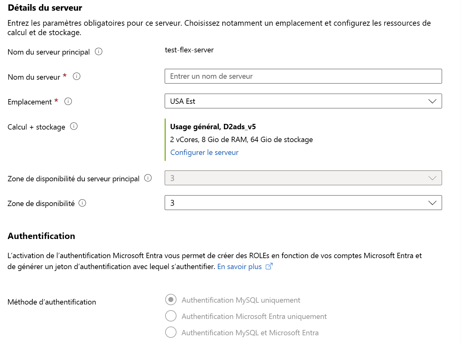 Après avoir créé le replica de lecture, vous pouvez configurer le nom du serveur de replica et ses paramètres de calcul et de stockage. Vous ne pouvez pas modifier certains paramètres, comme l’authentification, qui sont hérités du serveur principal.