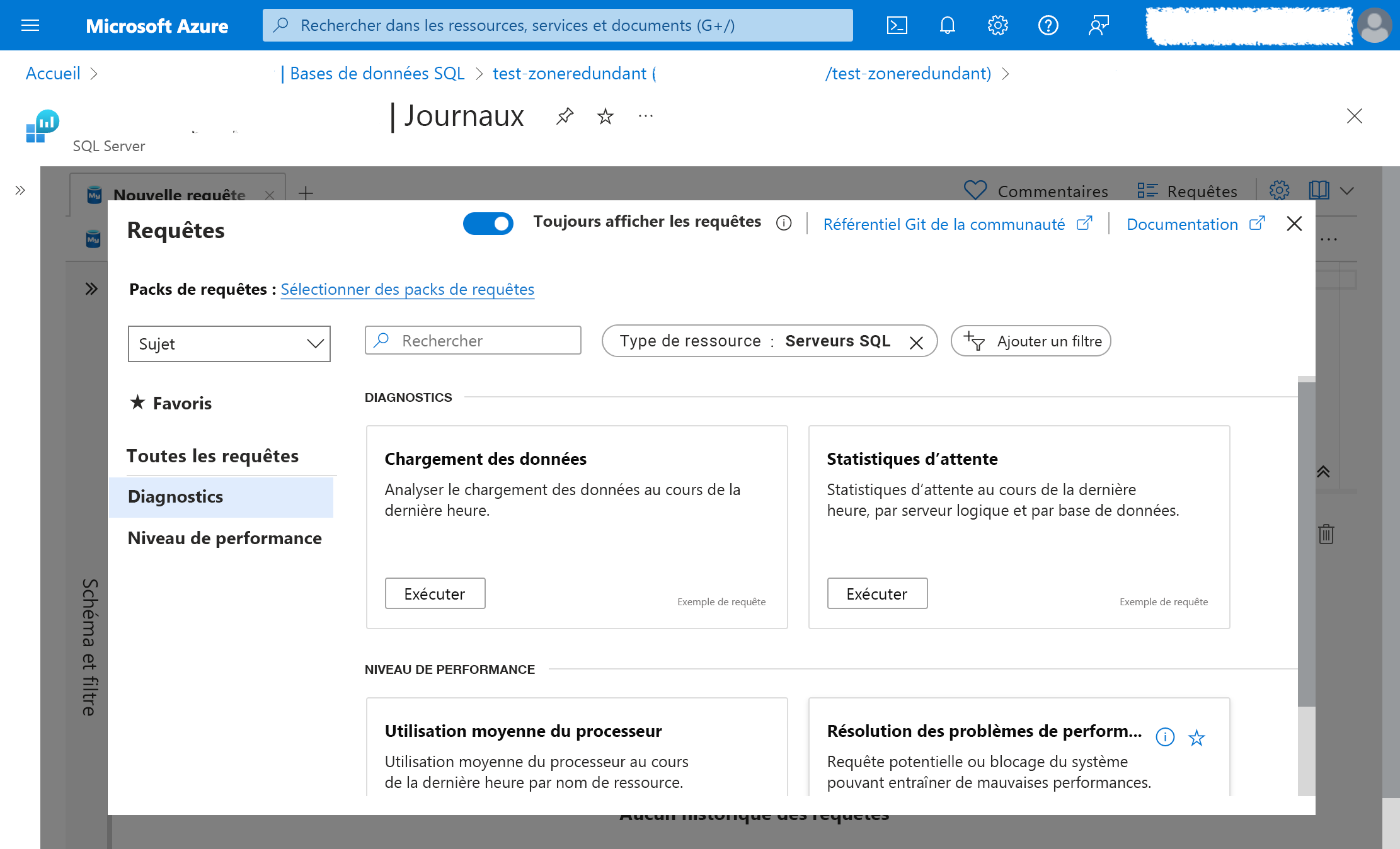 Une fois la journalisation des requêtes lentes activée, vous pouvez afficher les insights sur les performances des requêtes à l’aide de l’analytique des journaux d’activité ou de classeurs de visualisation. Pour accéder aux insights sur les performances des requêtes, suivez les mêmes étapes que celles ci-dessus, mais sélectionnez Analyse des performances des requêtes au lieu de Vue d’ensemble.