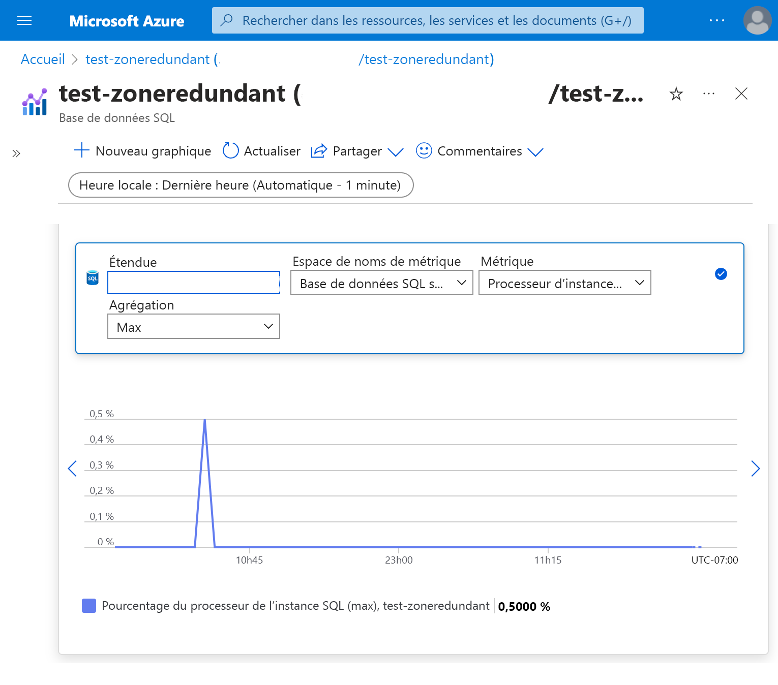 Le Portail Azure permet d’accéder à un certain nombre de métriques que vous pouvez utiliser pour superviser les performances de la base de données. Par exemple, vous pouvez visualiser le pourcentage de processeur utilisé par un serveur flexible.