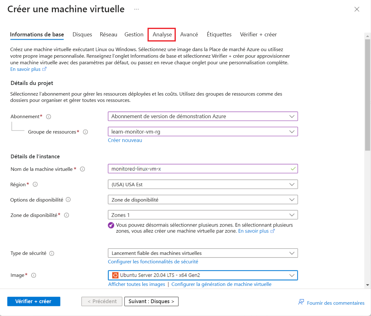 - Pour le nom de la machine virtuelle, entrez monitored-linux-vm.