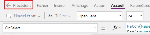Accédez à la barre de formule, puis examinez la formule pour OnSelect. Lorsque l’utilisateur sélectionne l’option Réserver, une fonction Patch() permet de créer une ligne Réservation. Cette nouvelle ligne a des relations avec le bureau et votre utilisateur. La relation utilisateur est définie à partir d’une variable globale établie dans l’application au démarrage.