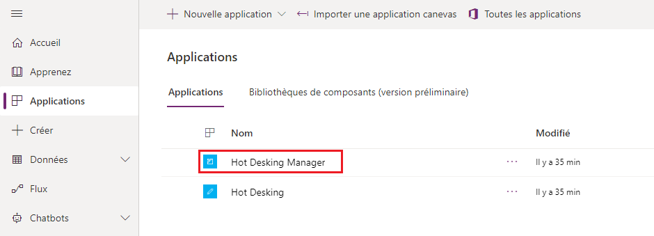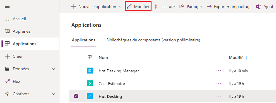 Vérifiez qu’Applications est toujours cliqué, sélectionnez l’application Hot Desking, puis cliquez sur Modifier. L’application devrait s’ouvrir dans make.powerapps.com.