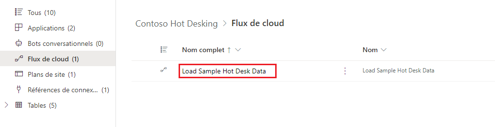 Cliquez sur Flux de cloud, puis sélectionnez le flux Load Sample Hot Desk Data pour l’ouvrir.