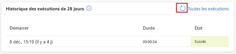 Cliquez sur Terminé, puis attendez la fin de l’exécution du flux. Cliquez sur le bouton Actualiser pour afficher le statut de l’exécution du flux. Un statut Réussi devrait s’afficher une fois le flux exécuté.