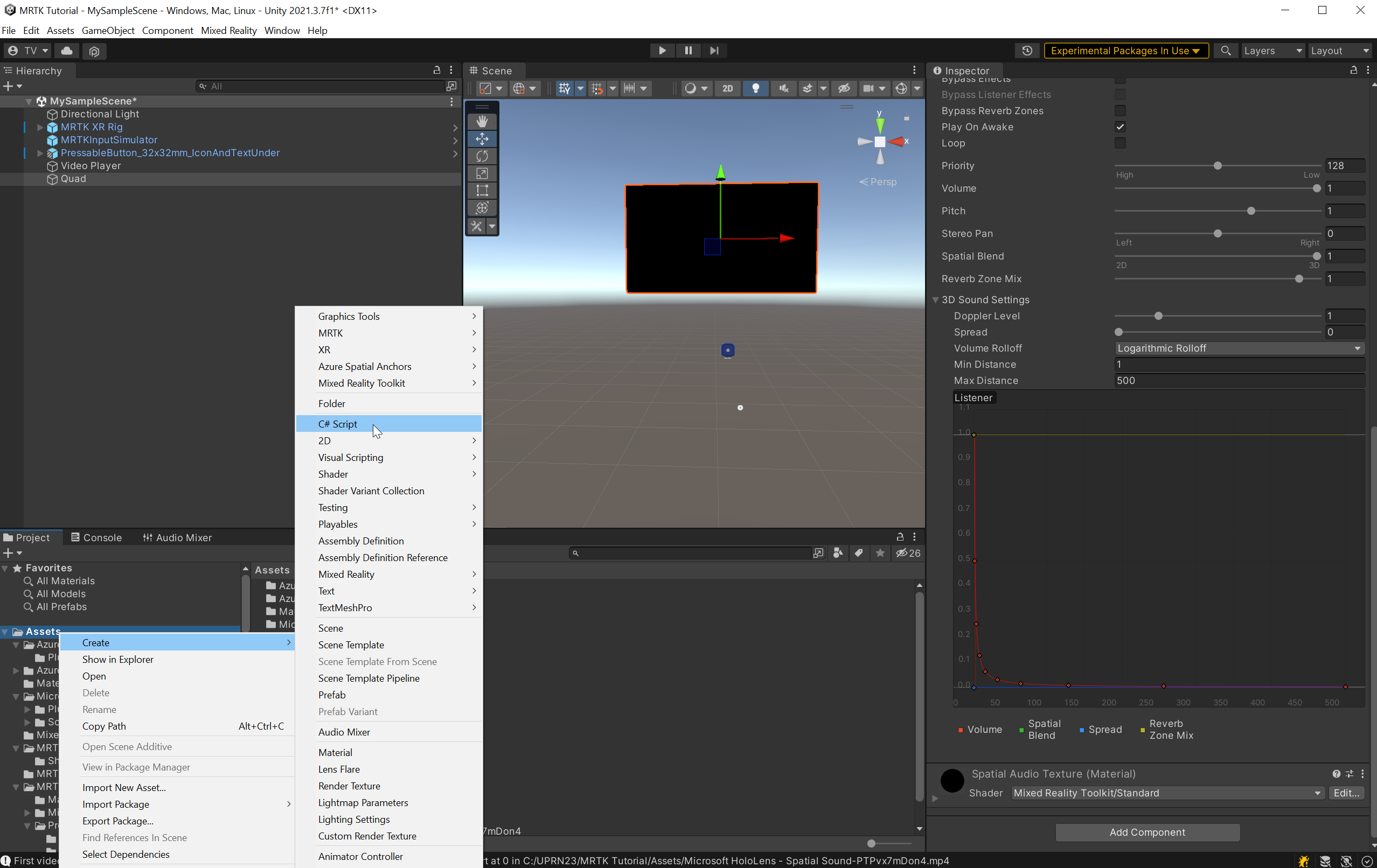 Cliquez avec le bouton droit dans la fenêtre Projet et choisissez Créer> unscript C# pour créer un script C#. Entrez un nom approprié pour le script ; par exemple , SpatializeOnOff.