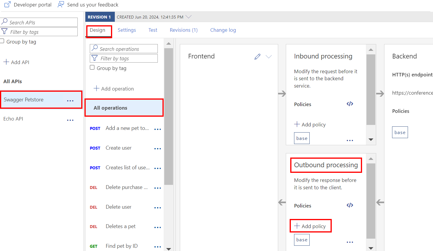 構成が済むと、[送信処理] セクションに set-header ポリシー要素が表示されます。