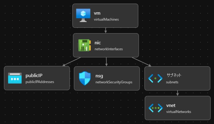 Bicep ビジュアライザーには、Bicep ファイルで定義されたリソースと、それらの間の依存関係が表示されます。 次の図は、Linux 仮想マシン用の Bicep ファイルを視覚的に表現したものです。