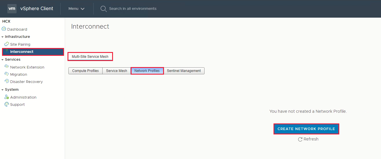 [インフラストラクチャ] で、 [Interconnect](相互接続)>[Multi-Site Service Mesh](マルチサイト サービス メッシュ)>[Network Profiles](ネットワーク プロファイル)>[Create Network Profile](ネットワーク プロファイルの作成) を選択します。