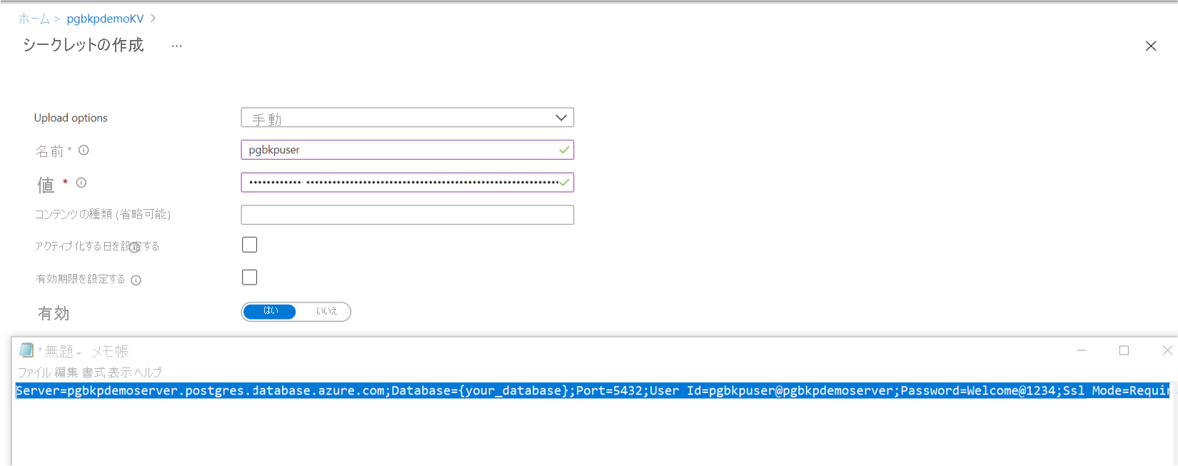 シークレットが Azure Database for PostgreSQL サーバーの接続文字列 ADO.NET 形式であることを確認します。 この文字列は、サーバーでバックアップ特権を持つデータベース ユーザーの資格情報で更新する必要があります。 キー コンテナーでシークレットを作成する方法の詳細について説明します。