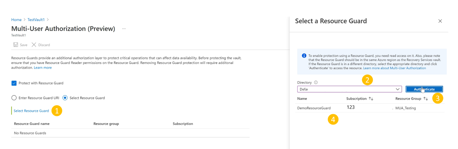MUA を有効にし、Resource Guard を選択するには、次のいずれかの操作を実行します。