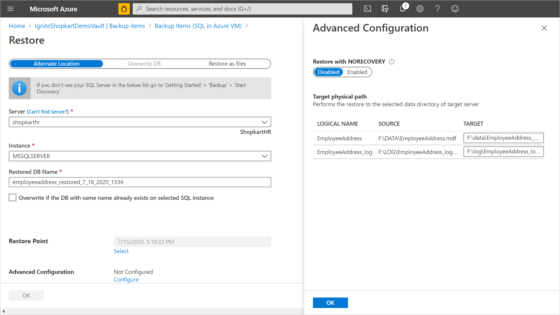 データベース内のファイルの文字列サイズの合計が特定の制限より大きい場合、Azure Backup でデータベース ファイルの一覧が別の PIT コンポーネントに格納されるため、ユーザーは復元操作中にターゲット復元パスを設定できません。 代わりに、ファイルが SQL の既定のパスに復元されます。