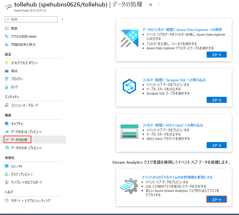 左側のナビゲーション メニューで、[機能] を展開し、[データの処理] を選択して、[イベントからのリアルタイムの分析情報を有効にする] タイルで [開始] を選択します。