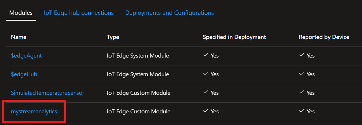 Stream Analytics の追加でデプロイが完了したら、[モジュールの設定] ページに 2 つの新しいモジュールが表示されることを確認します。