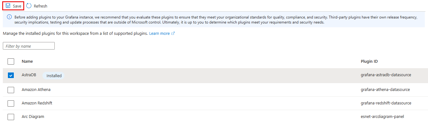 プラグインを Grafana インスタンスに追加する前に、これらのプラグインを評価して、品質、コンプライアンス、およびセキュリティに関する組織の標準を満たしていることを確認することをお勧めします。 サード パーティ製プラグインには、Microsoft の管理下にない独自のリリース頻度、セキュリティへの影響、テストおよび更新プロセスがあります。 最終的には、要件とセキュリティのニーズを満たすプラグインを決定するのはユーザーの判断です。