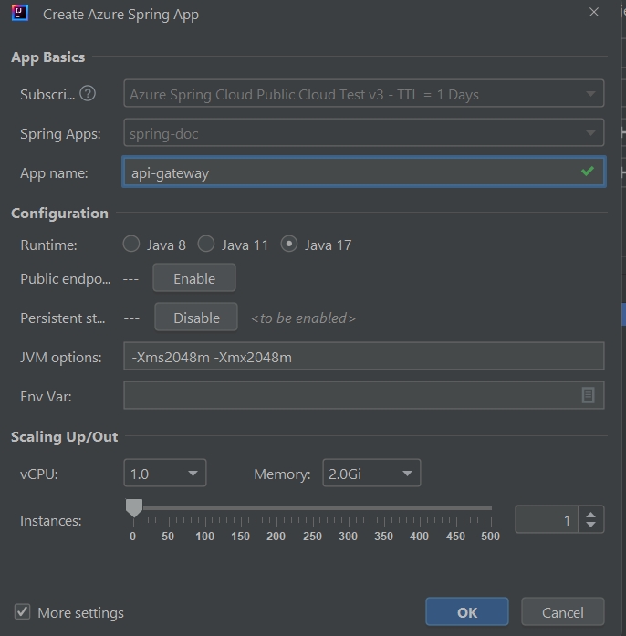 プロジェクトの Azure Spring Apps インスタンスに別のアプリを作成します。