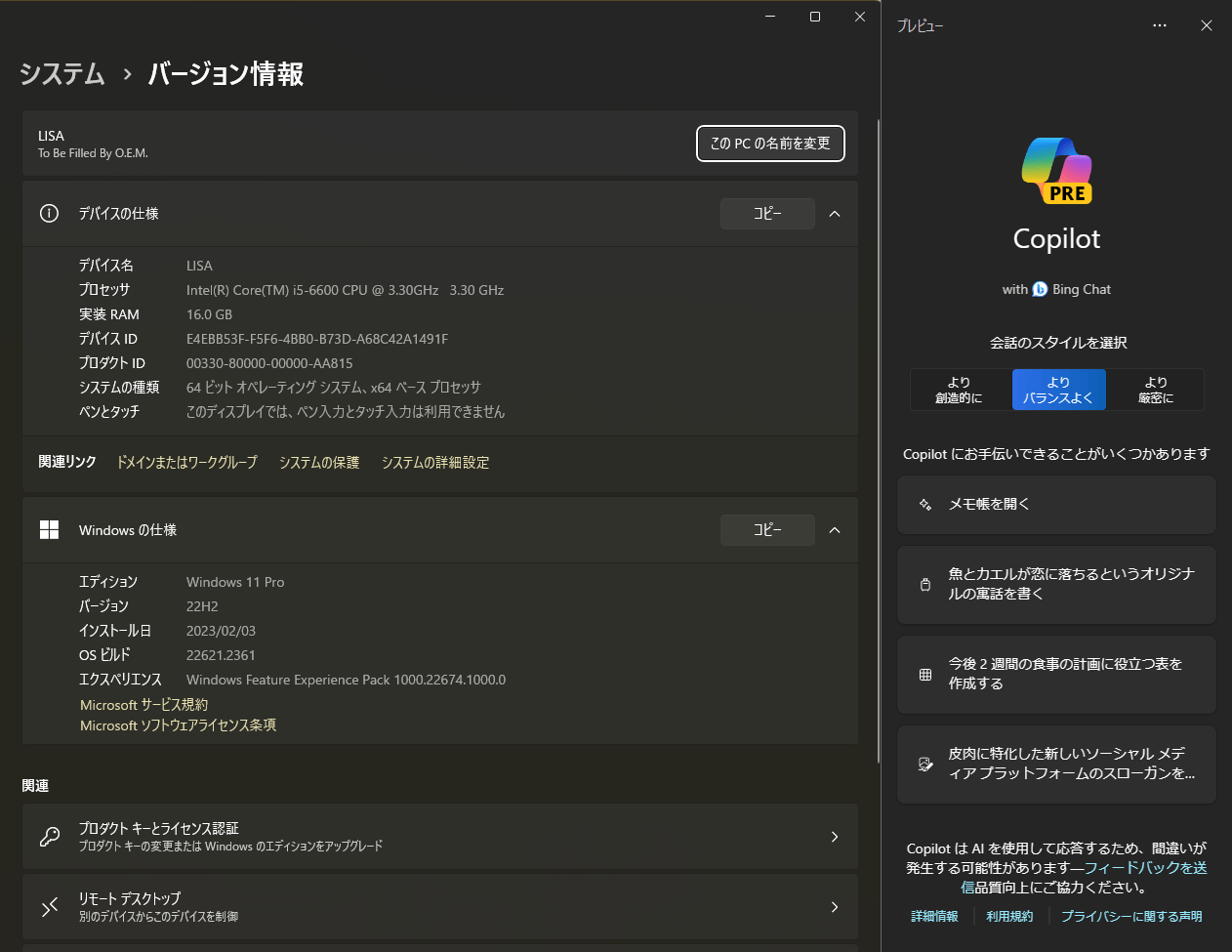 windows copilotが以前は使えていたのに使えなくなった。ショートカットキーを押しても起動しない。再起動したりViveToolを使ったりしたが戻らなかった。installed build:23550.1000 ni_prereleaseとなっている。