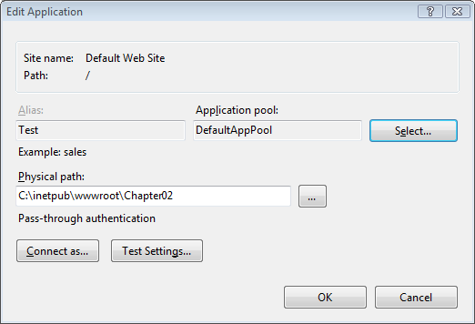 [アプリケーションの編集] ダイアログ ボックス内で要求処理モードを変更できることに注意してください。 [選択] ボタンをクリックし、アプリケーションに関連付けられているアプリケーション プールを変更します。 ASP.NET アプリケーションをクラシック モードから統合モードに変更するときに、互換性の問題があることに注意してください。 詳細については、次の記事をご覧ください。