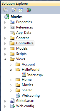 [追加] をクリックすると、次に示すように、新しいフォルダーと新しいファイルが [ソリューション] フォルダーに表示されます。 [ビュー] の下に [HelloWorld] フォルダーがあり、そのフォルダー内に Index.aspx ファイルがあります。