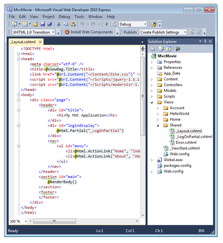 まず、ページの上部にある "My MVC Application" というタイトルを変更します。 そのテキストは、すべてのページに共通のものです。 これは、アプリケーションのすべてのページに表示されていますが、実際にはプロジェクトの 1 つの場所でのみ実装されています。 [ソリューション エクスプローラー] で /Views/Shared フォルダーに移動して、_Layout.cshtml ファイルを開きます。 このファイルはレイアウト ページと呼ばれるもので、その他のすべてのページで使用する共有 "シェル" です。