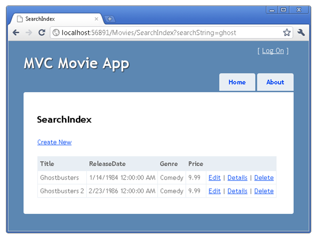 このセクションでは、映画をジャンルや名前で検索できる SearchIndex アクション メソッドを追加します。 これは /Movies/SearchIndex URL で利用できるようになります。 ユーザーからこの要求を受けたときには、映画を検索するための入力要素を含む HTML フォームを表示します。 そのフォームでユーザーの送信操作が行われると、アクション メソッドが、送信内容から検索用の値を取得し、データベースを検索します。