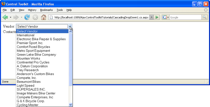 ASP.NET ページを読み込み、しばらくするとベンダーリストに 25 個のエントリが設定されます。 1 つのエントリを選択し、2 番目のドロップダウン リストにデータがどのように設定されているかを確認します。