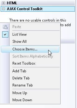 - [AJAX Control Toolkit] タブの下を右クリックし、メニュー オプションの [アイテムの選択] を選択します (図 5 を参照)。