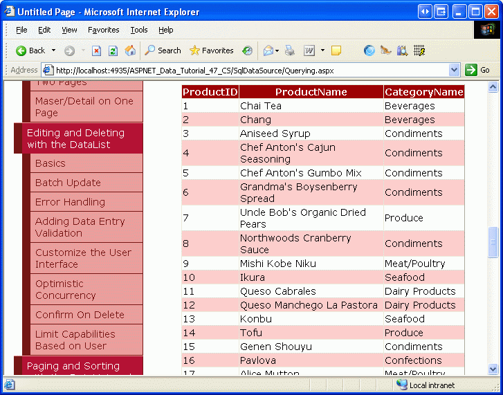 図 15: GridView が各製品の ID、名前、関連付けられているカテゴリ名を表示する (クリックするとフルサイズの画像が表示されます)