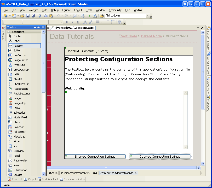 まず、EncryptingConfigSections.aspx フォルダーの AdvancedDAL ページを開きます。 ツールボックスから TextBox コントロールをデザイナーにドラッグし、ID プロパティを WebConfigContents に、TextMode プロパティを MultiLine に、Width および Rows プロパティをそれぞれ 95% と 15 に設定します。 この TextBox コントロールには、Web.config の内容が暗号化されているかどうかをすぐに確認できるように内容が表示されます。 もちろん、実際のアプリケーションでは、Web.config の内容を表示する必要はありません。
