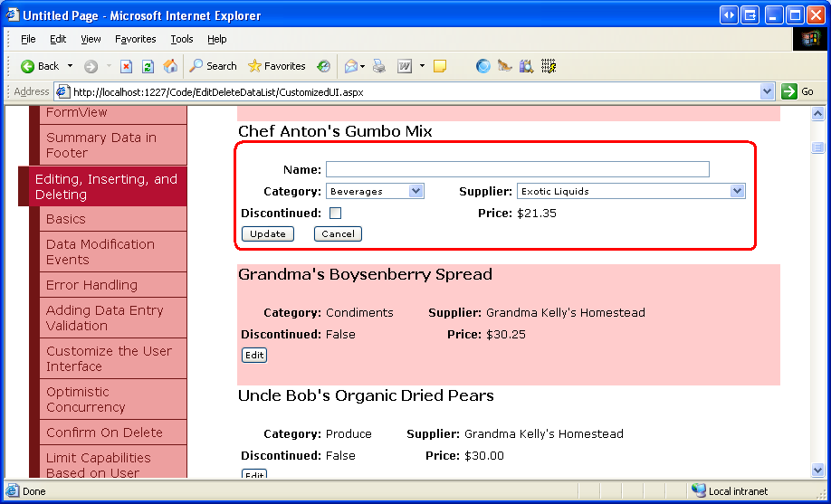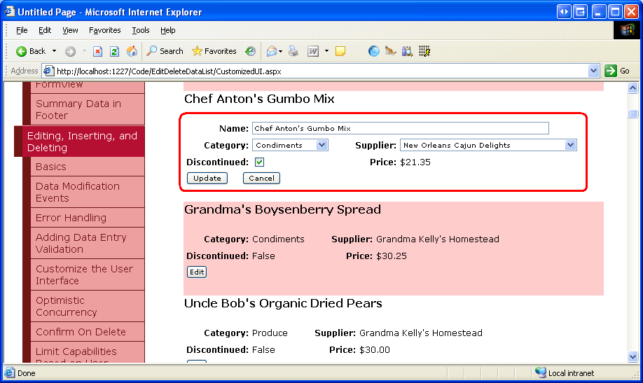Page.IsValid が True の場合、編集された商品の ProductID 値が DataKeys コレクションから読み取られ、EditItemTemplate 内のデータ入力 Web コントロールがプログラムによって参照されます。 次に、これらの Web コントロールの値が変数に読み取られてから、適切な UpdateProduct オーバーロードに渡されます。 データ更新後、DataList は編集前の状態に戻ります。