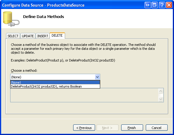 この変更により、ユーザーがいずれかドロップダウン リストから (None) オプションを選んだ場合、データベース値 Nothing に対応する値 UpdateProduct が NULL BLL メソッドに渡されます。