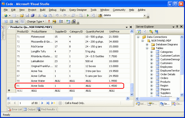 今回は新しい製品 (Acme Soda など) を追加するときに、新製品の CategoryID および SupplierID 列が 1 に設定されます (図 20 を参照)。