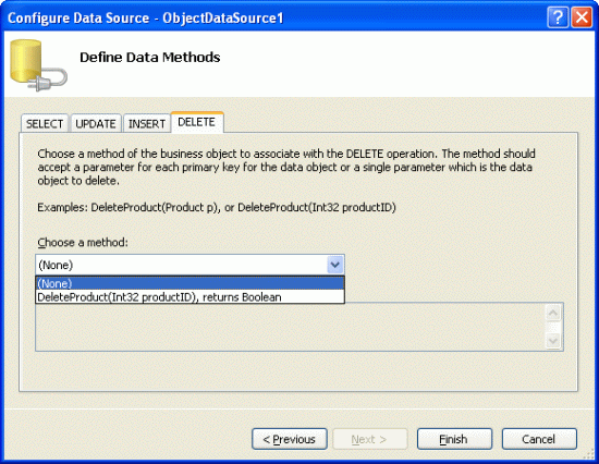 この例では、最初はデータの編集機能のみが必要で、レコードの挿入や削除は必要ないため、[INSERT] タブと [DELETE] タブに移動し、ドロップダウン リストから [(None)] を選択して、ObjectDataSource の Insert() および Delete() メソッドを ProductsBLL クラスのメソッドにマップしないことを明示的に示します。