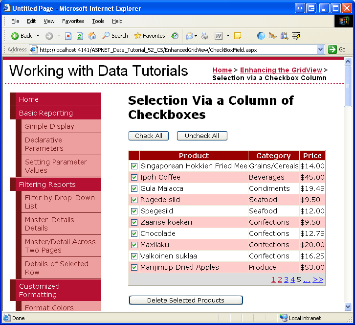 このチュートリアルでは、チェックボックスの列を追加する方法と、ポストバックでチェックされたチェックボックスを決定する方法について説明します。 特に、Web ベースの電子メール クライアントのユーザー インターフェイスを厳密に模倣する例を構築します。 この例では、 Products データベース テーブルの製品を一覧表示するページングされた GridView を、各行にチェック ボックスを付けます (図 1 を参照)。 [選択した製品の削除] ボタンをクリックすると、選択した製品が削除されます。