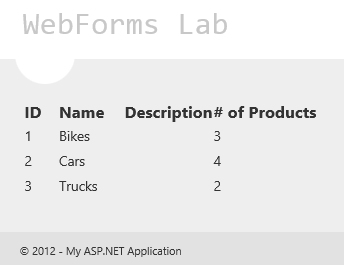 <asp:GridView ID="categoriesGrid" runat="server" AutoGenerateColumns="false" ItemType="WebFormsLab.Model.Category" DataKeyNames="CategoryId" SelectMethod="GetCategories"> <Columns> <asp:BoundField DataField="CategoryId" HeaderText="ID" /> <asp:BoundField DataField="CategoryName" HeaderText="Name" /> <asp:BoundField DataField="Description" HeaderText="Description" /> <asp:TemplateField HeaderText="# of Products"> <ItemTemplate><%#: Item.Products.Count %></ItemTemplate> </asp:TemplateField> </Columns> <EmptyDataTemplate> No categories found with a product count of <%#: minProductsCount.SelectedValue %> </EmptyDataTemplate> </asp:GridView>Products.aspx.cs 分離コードを開き、次の using ステートメントを追加します。