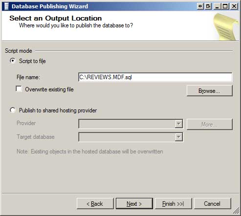 次の画面から、スクリプト ファイルを生成できます。または、Web ホストでサポートされている場合は、Web ホスト プロバイダーのデータベース サーバーにデータベースを直接発行できます。 図 7 に示すように、スクリプトを C:\REVIEWS.MDF.sql ファイルに書き込んでいます。