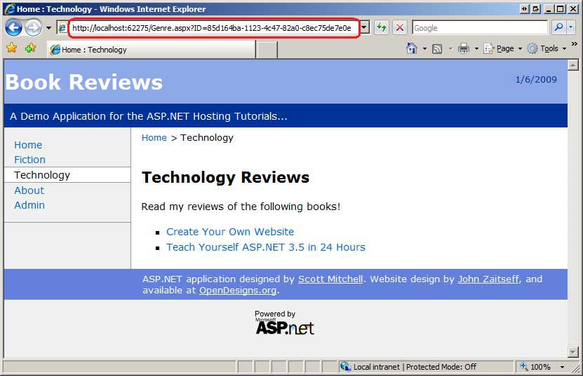 以前のバージョンの Book Reviews Web サイトには、書籍ごとに個別の ASP.NET ページがありました。 たとえば、~/Tech/TYASP35.aspx というページがあり、そこには「Teach Yourself ASP.NET 3.5 in 24 Hours」のレビューが含まれていました。 この新しいデータ ドリブン バージョンの Web サイトには、データベースに保存されたレビューと、指定された書籍のレビューを表示する単一の ASP.NET ページ (Review.aspx?ID=bookId) があります。 同様に、指定したジャンルのレビューされた書籍を一覧表示する Genre.aspx?ID=genreId ページがあります。