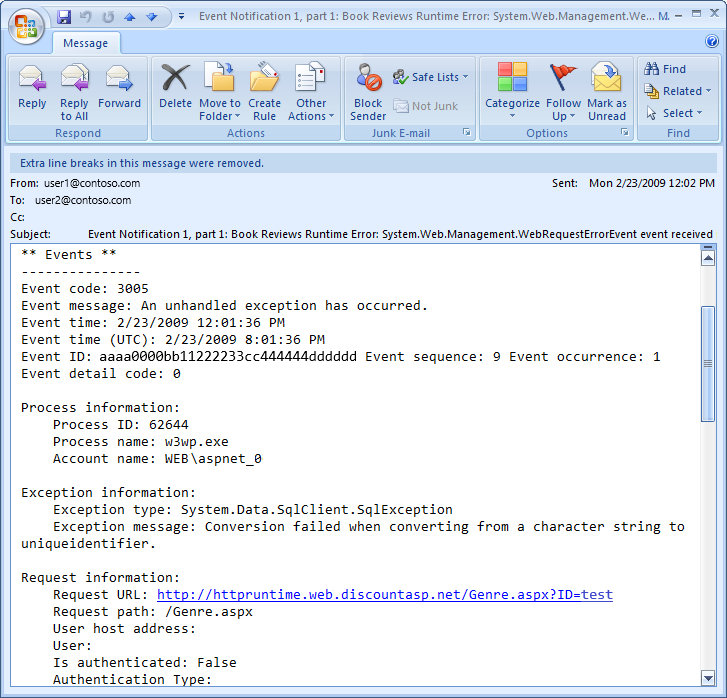 図 2 は、Genre.aspx?ID=foo へのアクセス時に SimpleMailWebEventProvider クラスによって生成された電子メールを示しています。