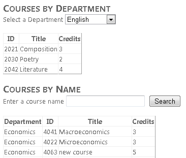 他のデータ ソース コントロールと同様に、パラメーター値を Where プロパティに渡すことができます。 チュートリアルの第 2 部で作成した [Courses.aspx] ページでは、このメソッドを使用して、ユーザーがドロップダウン リストから選択した部門に関連付けられているコースを表示できます。