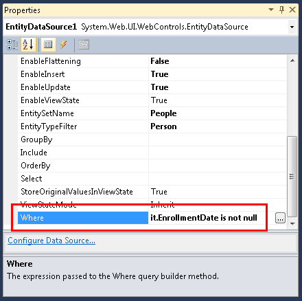 デザイン ビューに切り替え、EntityDataSource コントロールを選択します。 [プロパティ] ウィンドウで、 Where プロパティを it.EnrollmentDate is not nullに設定します。