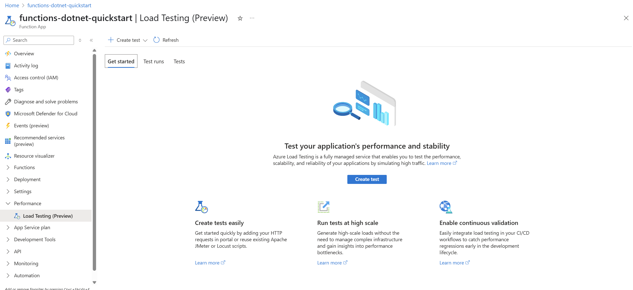 - 関数アプリに関連付けられたロード テストの実行を表示する