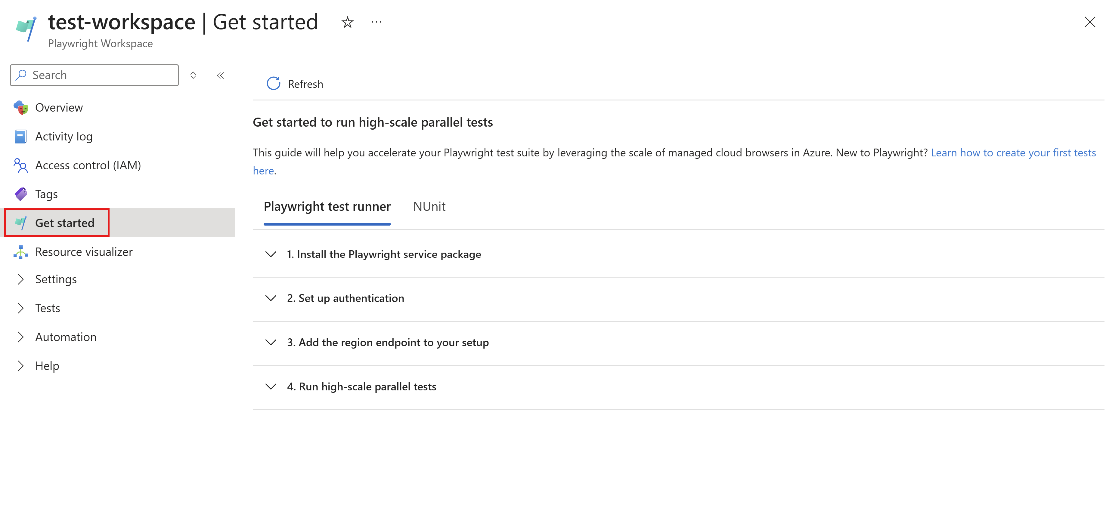 Playwright ワークスペース。 Playwright テストの大規模な実行に関するクイックスタートを済ませて、ワークスペースを作成します。