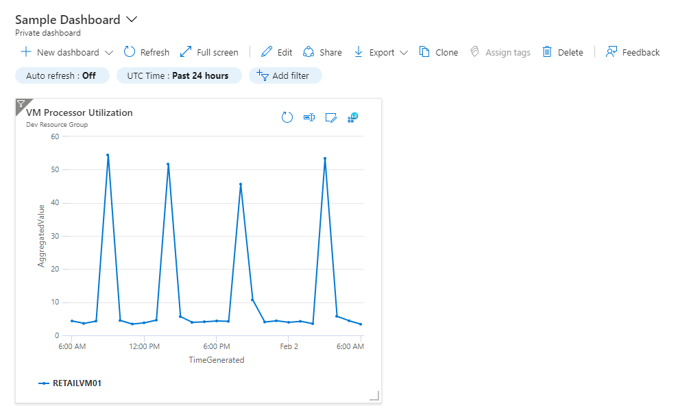 Azure Log Analytics からのテレメトリを含め、すべての Azure リソースの IT にとって最重要な運用データをここにまとめて表示できます。 ログ クエリを視覚化する前に、まずダッシュボードを作成して共有しましょう。 その後、折れ線グラフとして表示される、パフォーマンス ログ クエリの例に焦点を当てます。これはダッシュボードに追加できます。