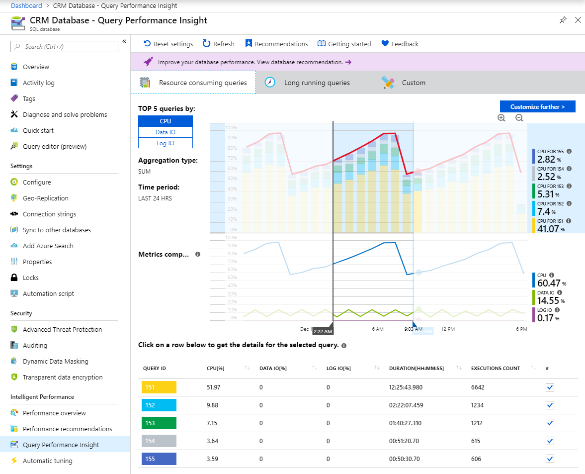 データベース のパフォーマンスに関する推奨事項については、[Query Performance Insight] ナビゲーション ウィンドウで Azure SQL Database の Database Advisor のパフォーマンスに関する推奨事項 を選択します。