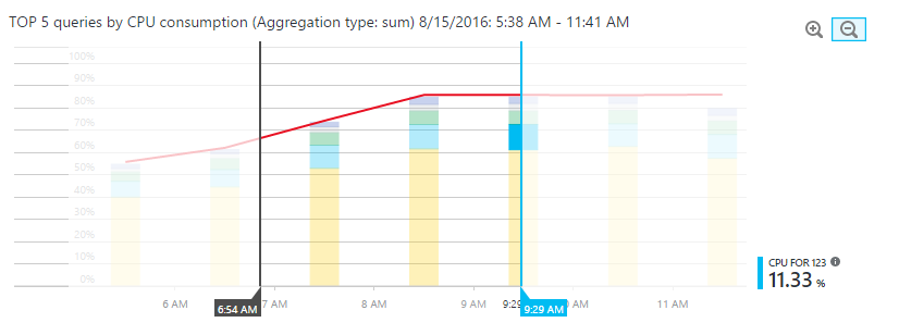 • 一番上のグラフの折れ線は、データベース全体の DTU の割合を示しています。 棒グラフは、選択されたクエリで消費された CPU の割合を示しています。