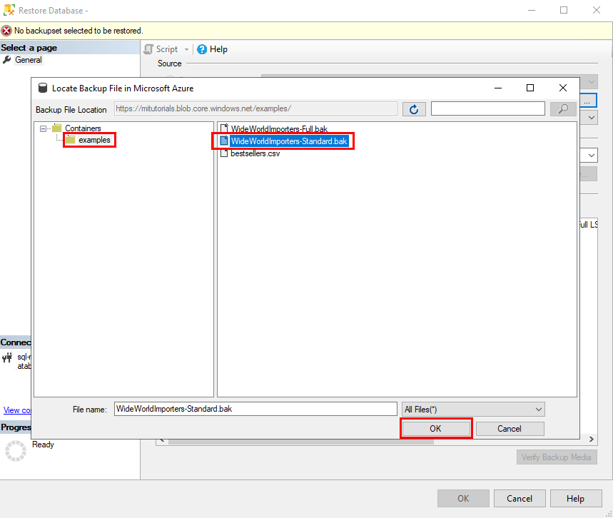 WideWorldImportersサンプル データベースを含むパブリックにアクセス可能な読み取り専用 BLOB ストレージを示しています。SSMS によってバックアップ セットが検証されます。 このプロセスには数秒しかかかりません。 所要時間は、バックアップ セットのサイズによって異なります。