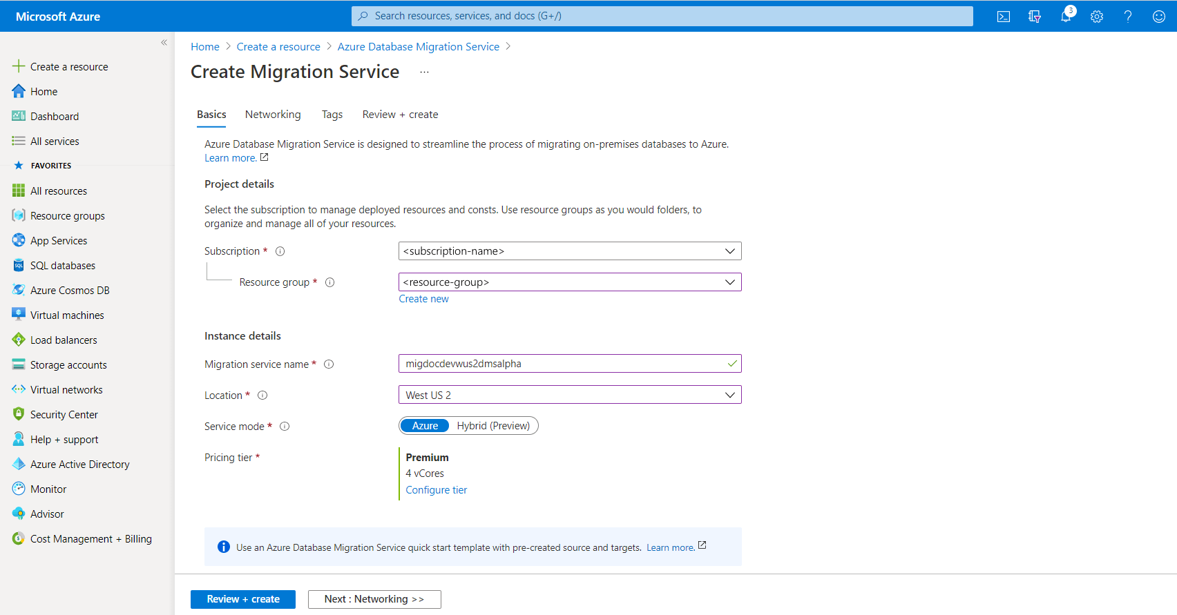 [移行サービスの作成] 画面で、サービスの名前、サブスクリプション、新規または既存のリソース グループを指定します。